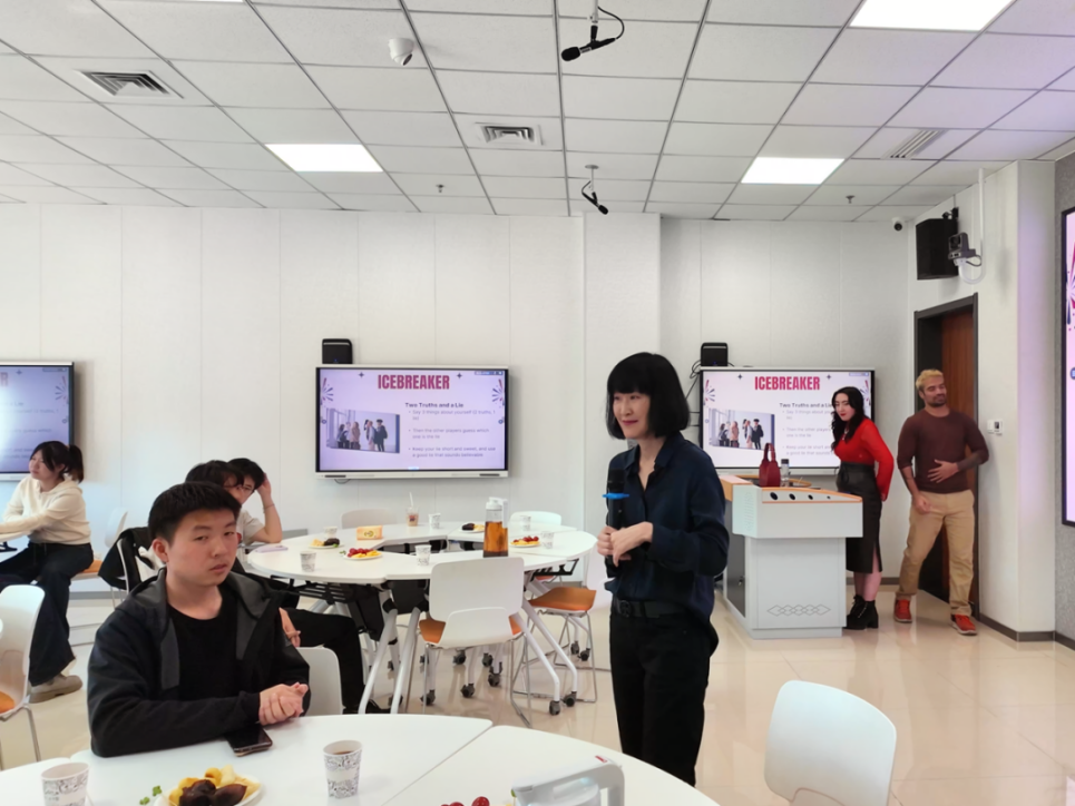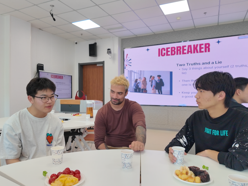 活动伊始,外籍教师们以风趣幽默的自我介绍迅速拉近了与同学们的距离。首个环节 “Two Truths, One Lie” 破冰游戏更是瞬间点燃现场气氛。教室里欢声笑语不断,为后续深入交流营造了开放、包容的良好环境。