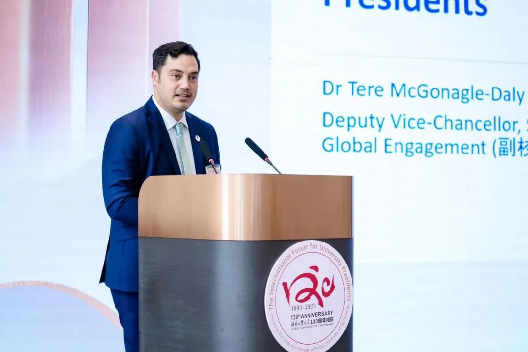 由新西兰梅西大学分管学生与国际事务副校长特洛·马克格内格·达利(Tere McGonagle-Daly)作题为《高等教育工程的挑战与机遇》的报告。