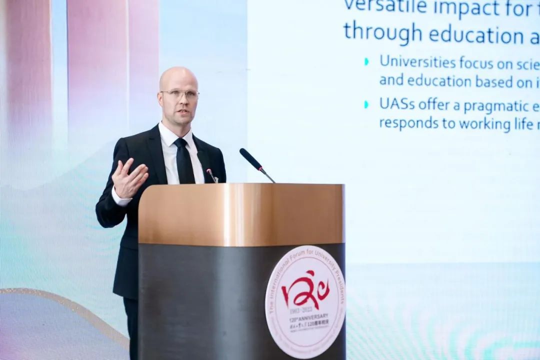 由芬兰拉彭兰塔-拉赫蒂工业大学校长具哈·马缇·卡勒沃·萨克撒(Juha-Matti Kalervo Saksa)作题为《从北欧视角探讨工业大学向可持续发展大学的转型》的报告。