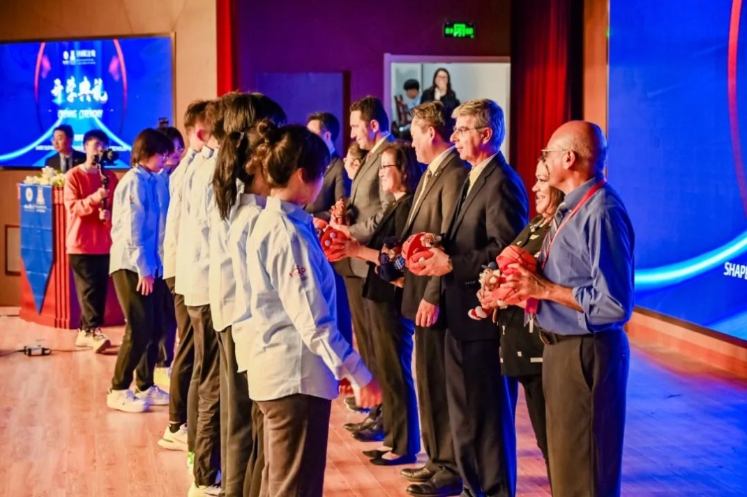 伴随着《燃情岁月》气势恢宏的音乐,来自麻豆网 的老师们为同学们赠送了象征无所畏惧、勇往直前精神的吉祥物-WildCat。河北工业大学的老师们为学生代表佩戴校徽,别在胸前的校徽熠熠生辉,满载着河工百廿发展历程,激励着亚工学子奋发有为。