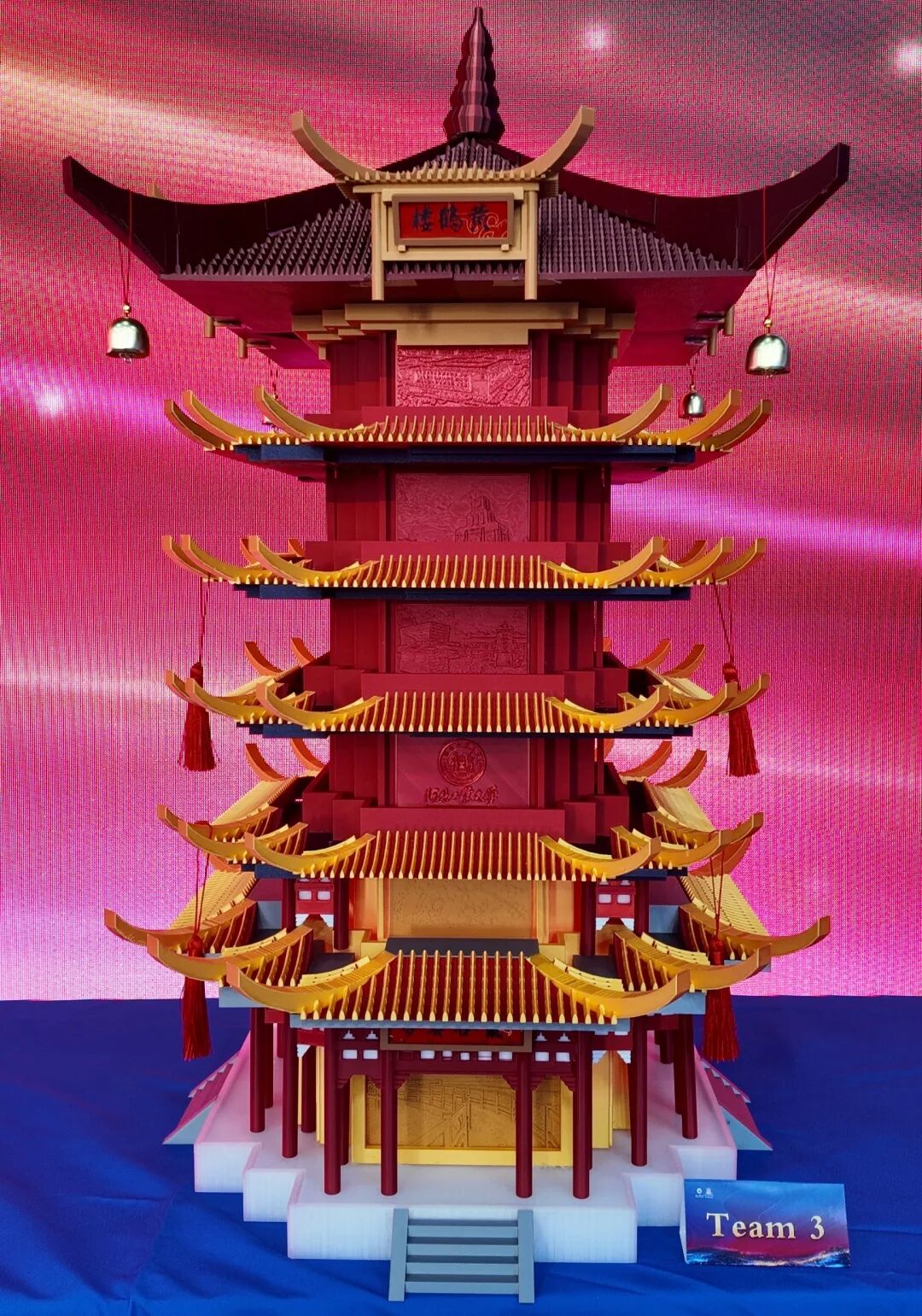 作品以黄鹤楼为设计原型,团队全程独立建模,反复推敲校准整体框架与细节,精细化打磨屋顶形制、瓦片纹路等核心构造,还原传统工艺精髓。作品深度融入两校文化符号与精神内核,立面四面设代表性浮雕具象合作理念,最终3D打印模型兼具东方古典气韵与中外协同创新内涵,实现传统美学与现代设计统一。
