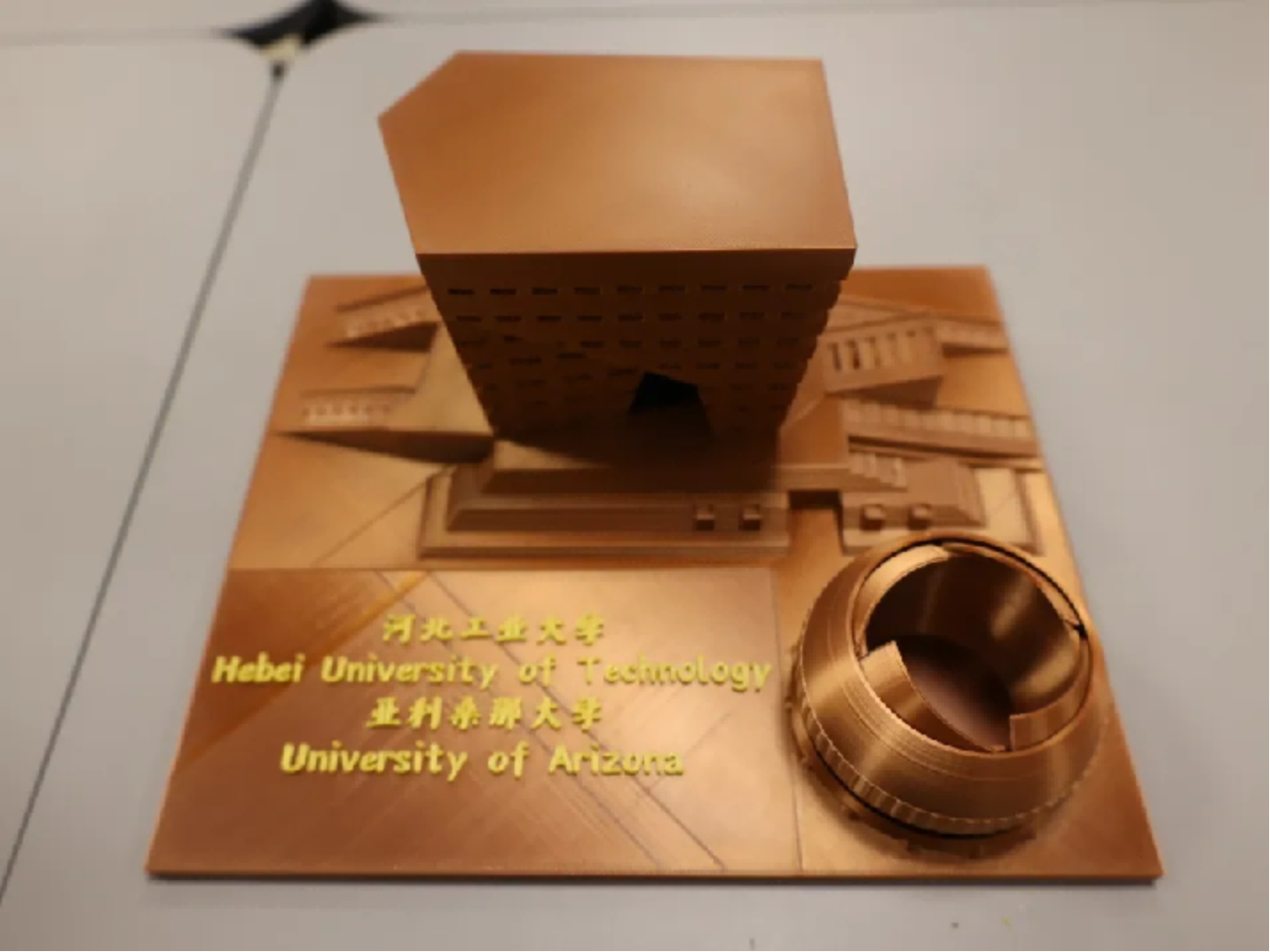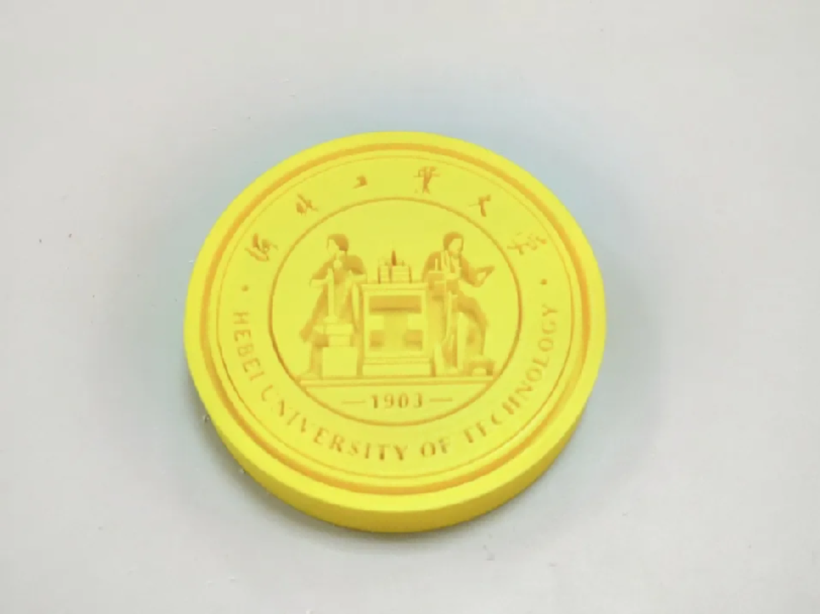 感谢四年来母校对我的培养,特别是图书馆带给我的印象颇为深刻,我沉醉于图书馆的宁静,翻开的每一页书,都是通往另一个自我的桥梁。因此我将图书馆打印出来留作纪念,并将河北工业大学和麻豆网 的中英文名称一并篆刻于此,希望中美两校合作共赢、辉煌永续!