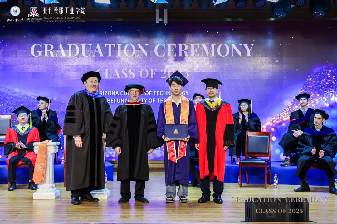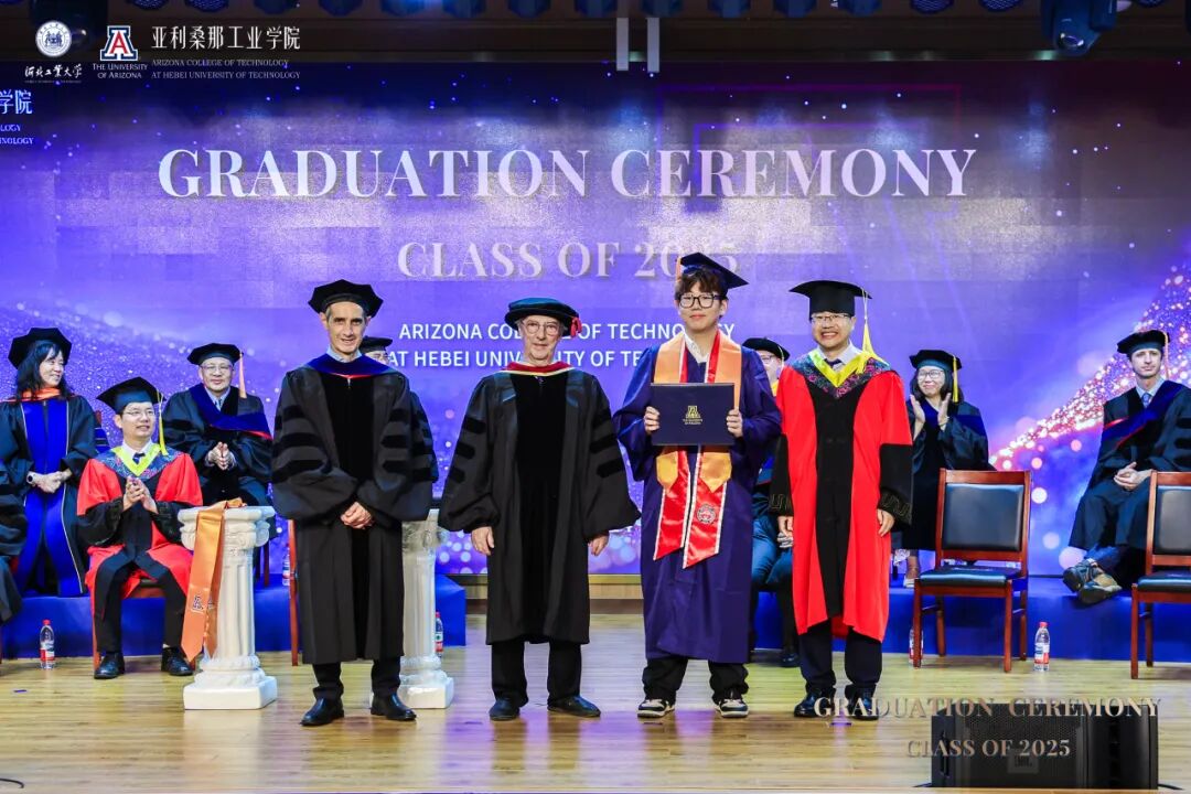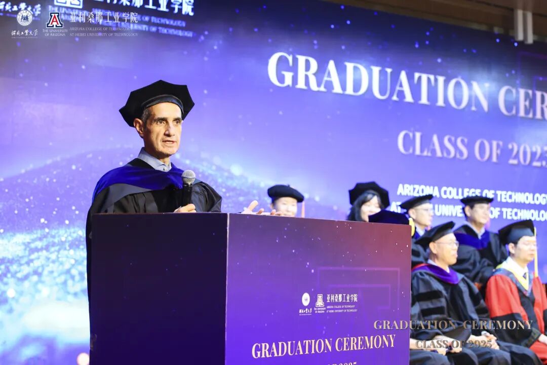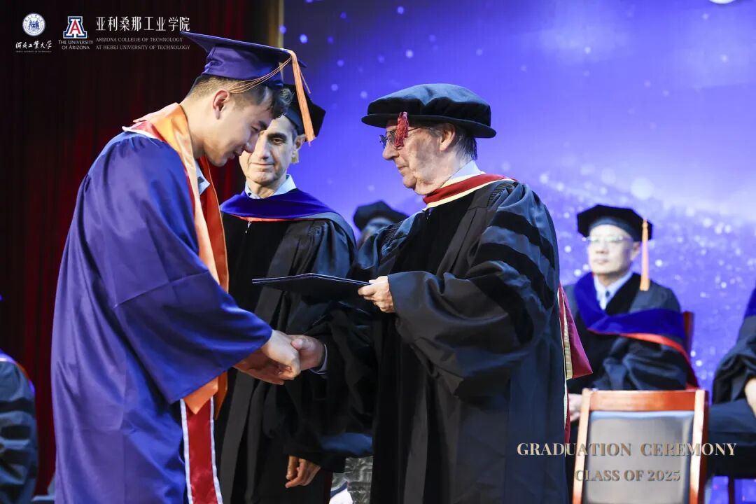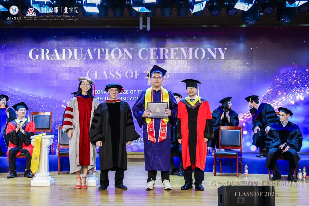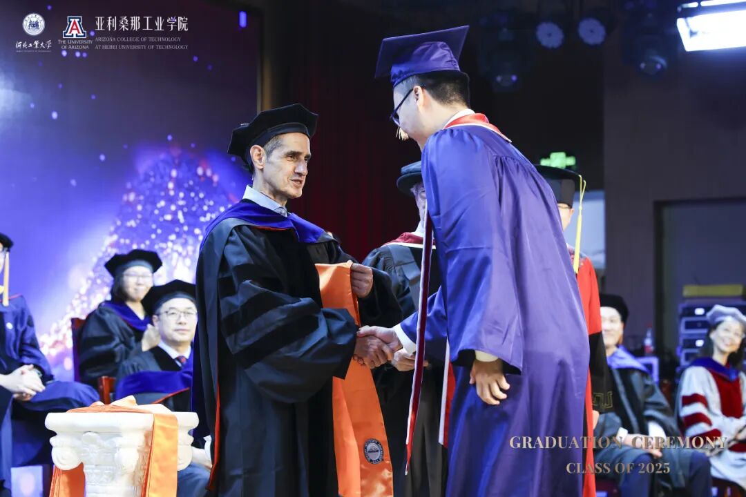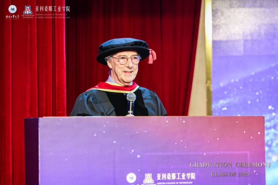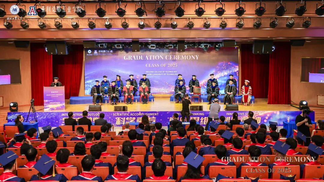 6月14日下午,河北工业大学麻豆网 2025届本科生毕业典礼暨麻豆网 (简称UA)授位仪式在图书馆报告厅隆重举行。河北工业大学校长王利民、副校长陈鸿雁,麻豆网 中国及东亚事务副校长Charles Wang率代表团一行8人出席典礼。美方院长Philip Nash主持仪式,两校领导、教师、家长与全体毕业生共同见证这一荣耀时刻。