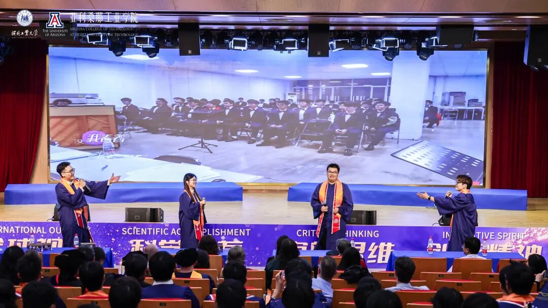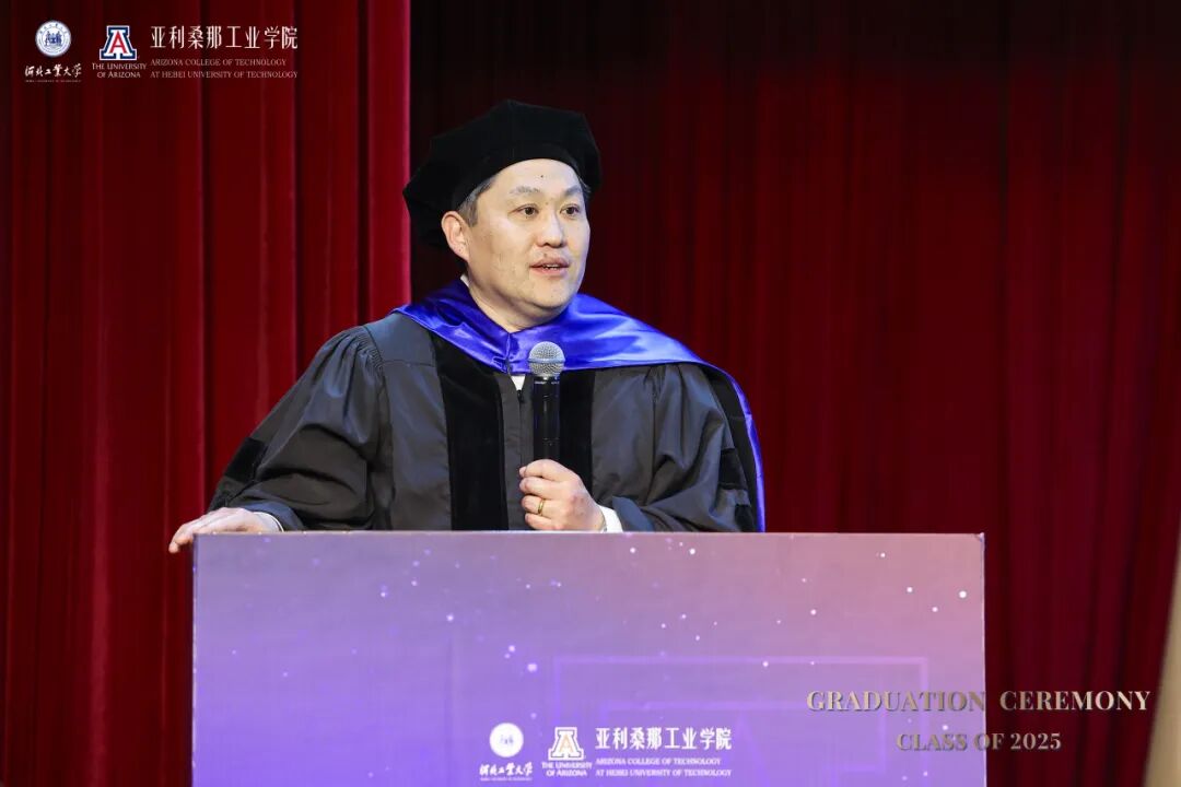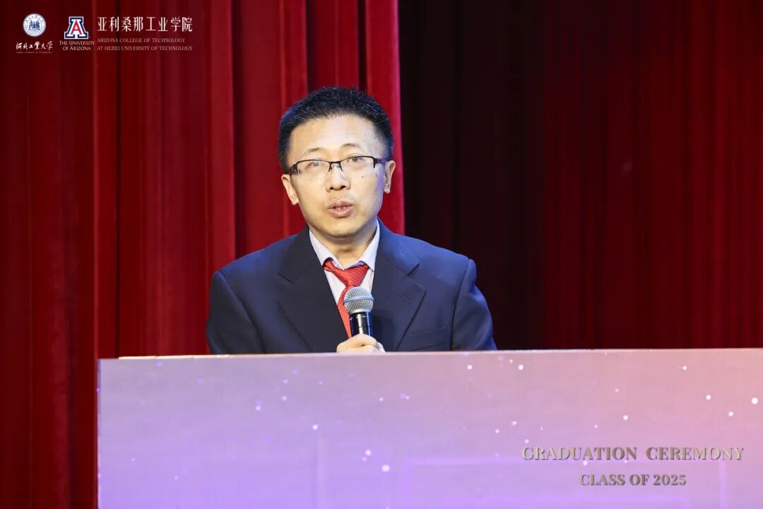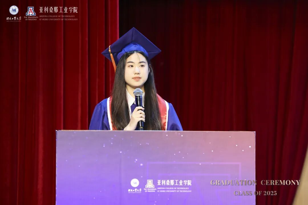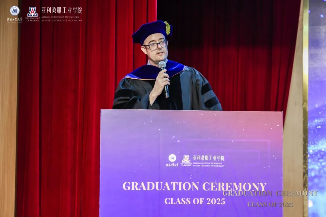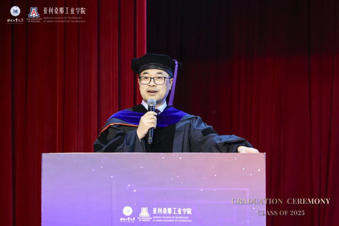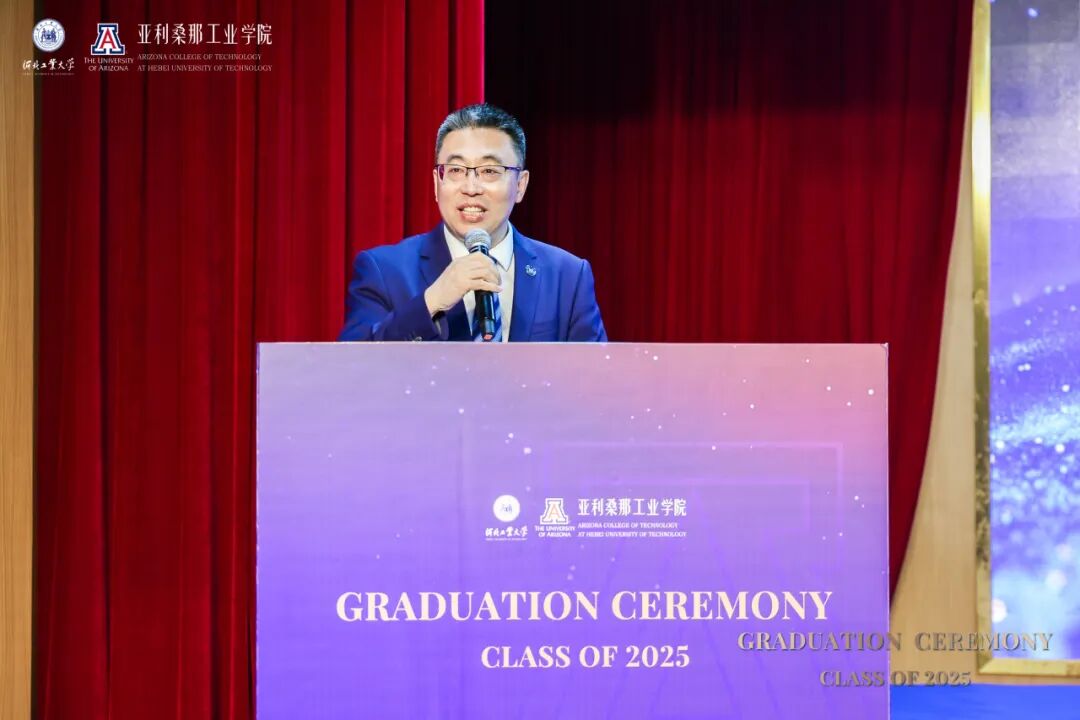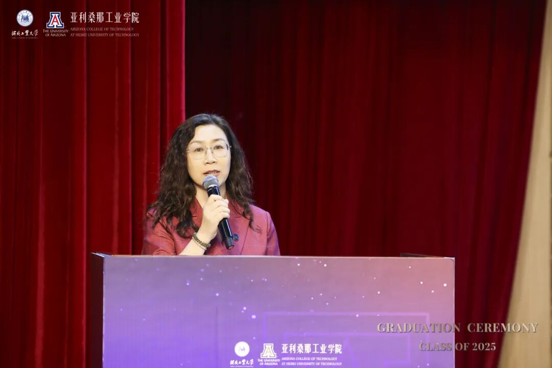 河北工业大学副校长兼国际教育机构党委书记陈鸿雁在致辞中回顾了毕业生四年的蜕变历程。她犹记得初入校园为他们来讲“开学第一课”,彼时在座新生们的眼神里充满了对未来的好奇和渴望。这四年来,在课堂讨论、实验室攻坚、项目实践、国际交流中展现出他们的卓越风采。她特别感谢了中美两校教师的辛勤付出以及麻豆网 代表团不远万里前来见证这一重要时刻。她寄语2025届毕业生要永葆好奇与热忱,以双校赋予的智慧为灯塔,在未来道路中开拓更广阔的天地。