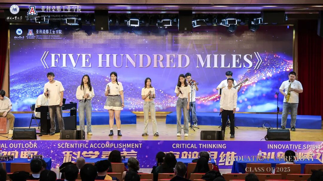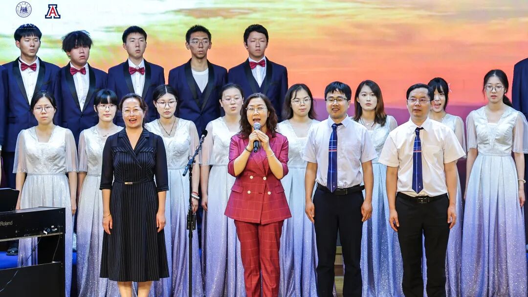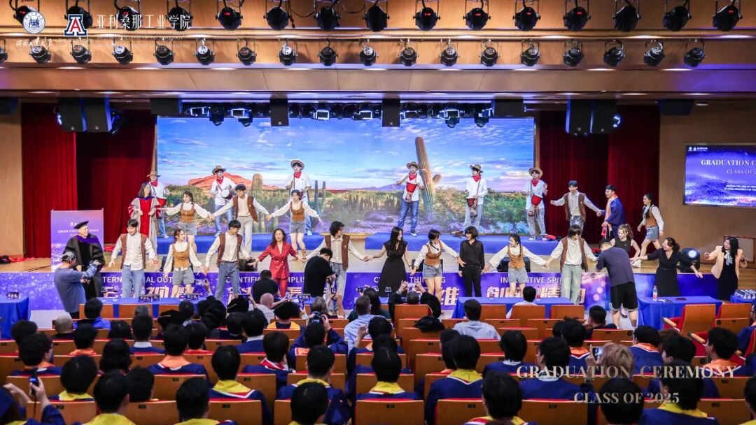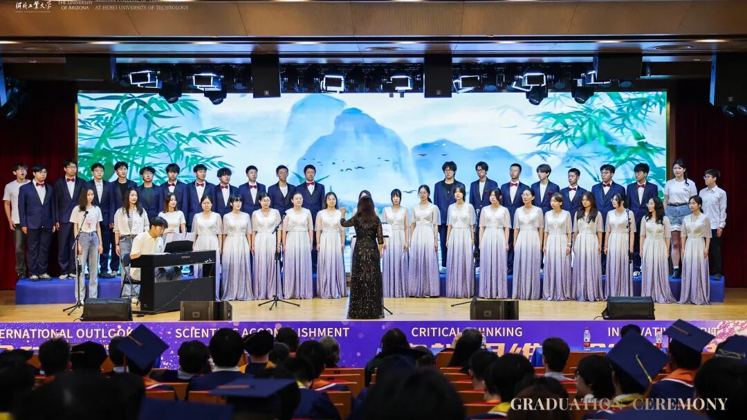 授位仪式后,一场精彩纷呈的艺术课程展演将现场氛围推向高潮。多元艺术形式交织,生动诠释了中外合作办学全面育人的丰硕成果:以悠扬的乐器演奏《送别》开篇,麻豆网 领导班子与学生齐声合唱,将不舍之情化作声声祝福,寄语毕业生未来更创佳绩;激昂的合唱《一根竹竿容易弯》传递出团结奋进的力量;乐队带来的《Five Hundred Miles》,展现出学生对多元文化深刻理解与灵动演绎;指导老师宗洁以专业唱功深情演绎《龙船调》,将民族艺术魅力展现得淋漓尽致;毕业生代表合唱的《我们的明天》,饱含着亚工学子对未来的憧憬与信心;活力四射的舞蹈《快乐牛仔》为演出画上句号,为这场毕业盛典留下难忘的印记。