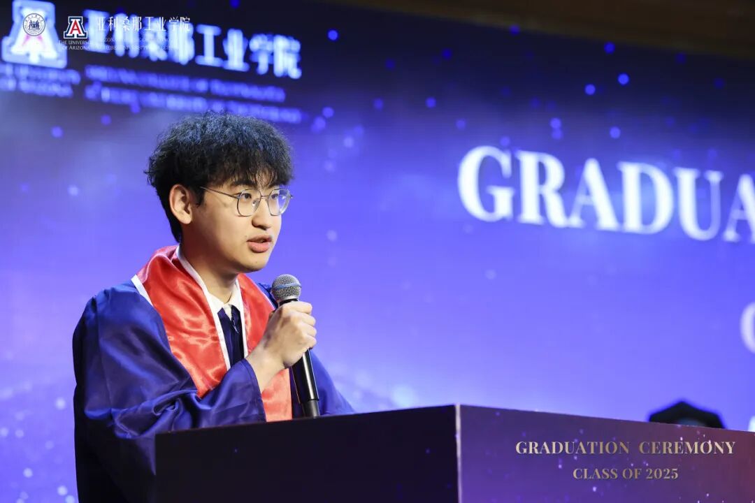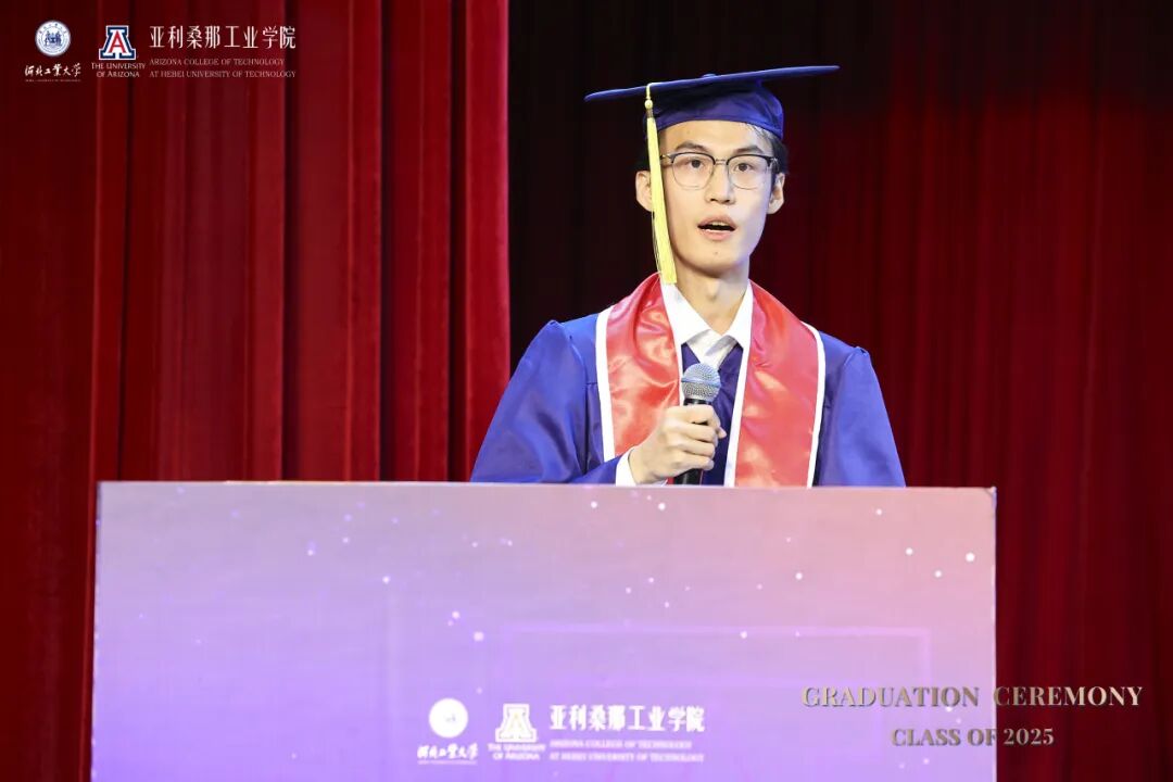 毕业生代表机械设计制造及其自动化专业学生赵仕譞以“工程师响应时代需求”为引,呼吁同学们以专业所长回应全球挑战。材料物理专业学生王怡萱则感恩四年的双语学习与跨文化成长,勉励同窗以多元视角开拓人生新篇。应用物理学专业学生李一彤以感恩之心回顾中外教授的悉心指导,感谢团队协作中的成长历练,他呼吁同窗扎实学识,以务实精神迎接未来挑战。