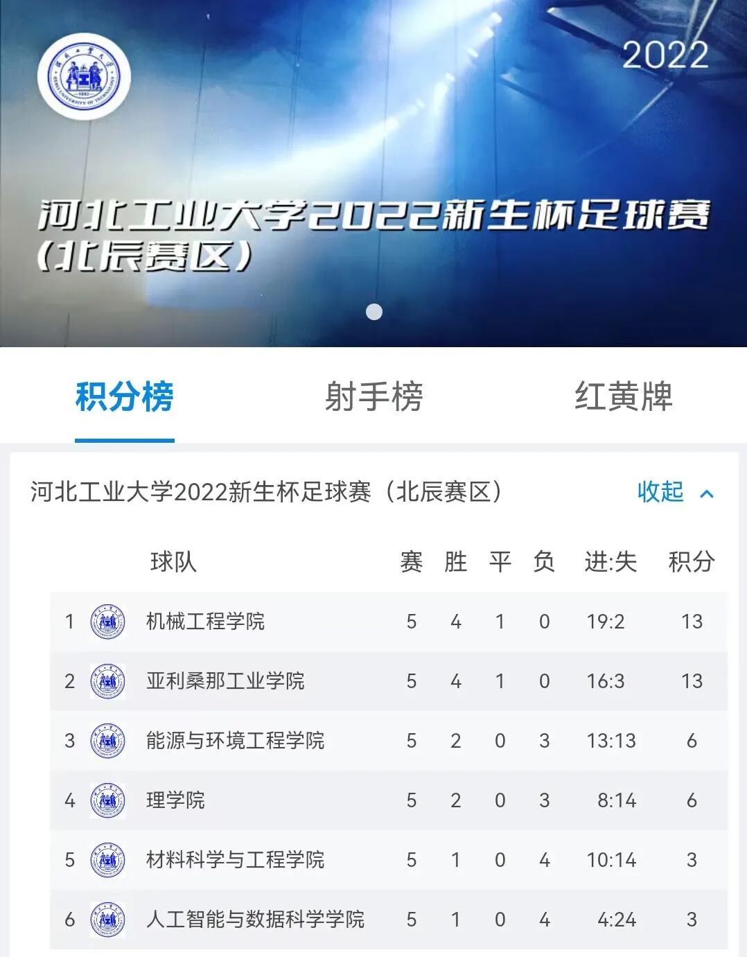 河北工业大学2022新生杯足球赛(北辰赛区)积分榜