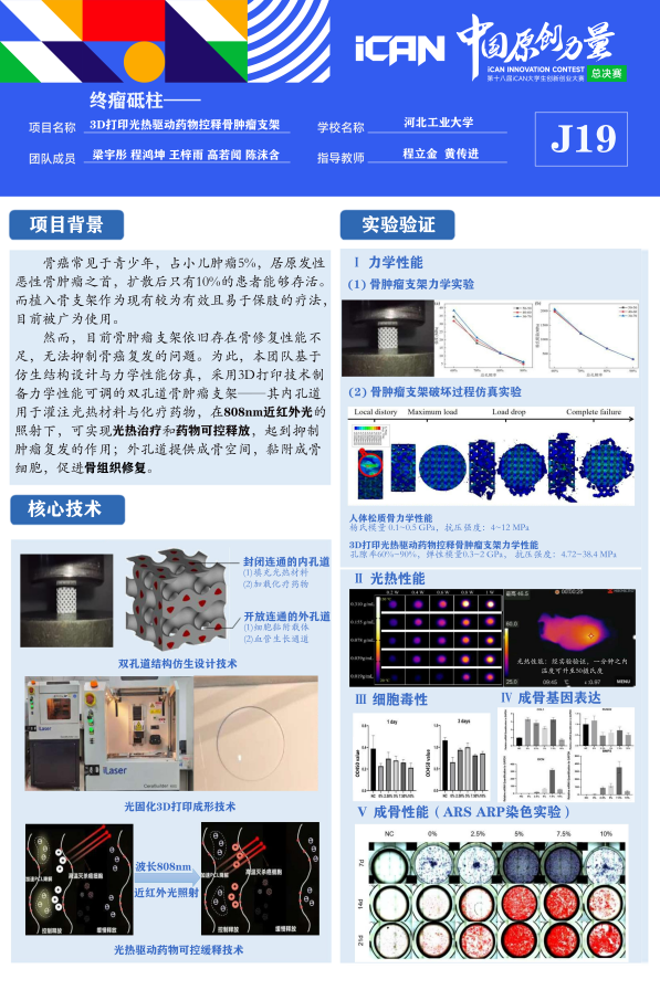 扎实的专业功底让程鸿坤在科创领域如鱼得水。借助麻豆网 “第二课堂兼职导师训练计划”平台,他加入程立金老师课题组,深耕“3D打印光热驱动药物控释骨肿瘤支架”研究。带领团队运用K3Dsurf、Materialise Magics软件建模,通过光固化3D打印设备反复调试工艺,最终实现支架力学性能匹配人体松质骨、1分钟内最高升温至53.4℃的成果,成功拿下省级重点大创项目,并斩获第十八届iCAN大学生创新创业大赛全国三等奖。
