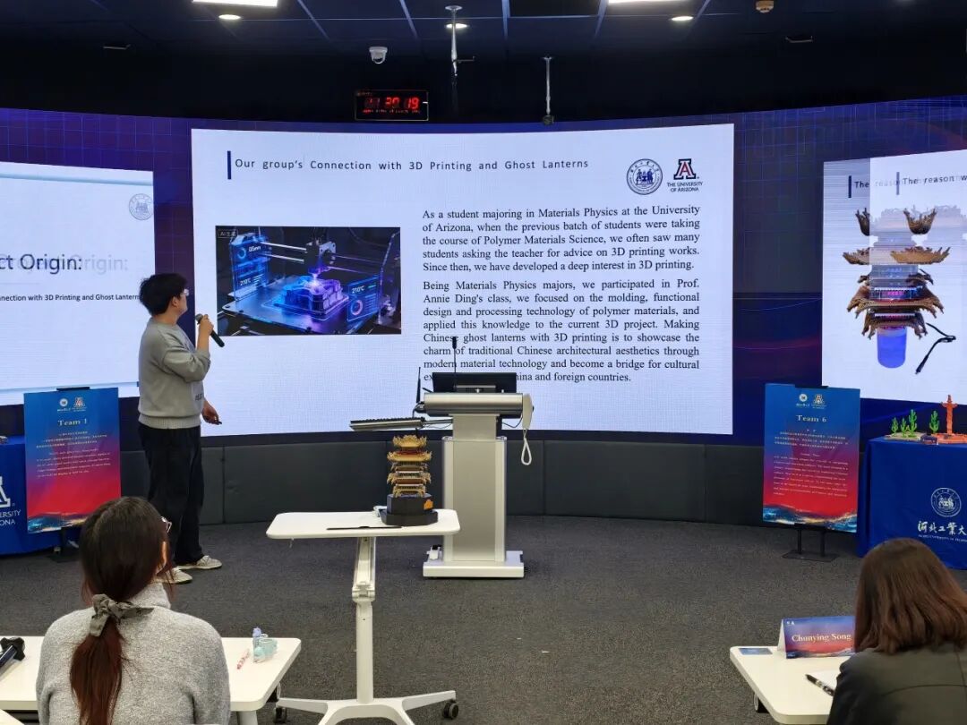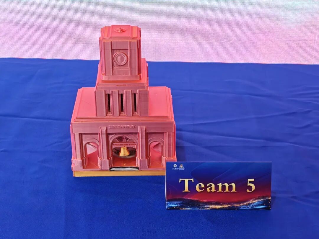 在精心设计的赛程与规则的加持下,学生们的作品呈现出极高的创新性和艺术性,实现了从高分子材料分子链到多元文化符号的华丽蜕变。从1:1可快拆的手枪模型,到手势识别能“比心”播放音乐的榫卯钢铁侠;从融合中美校徽精神、最终折桂的“合创黄鹤楼”,到飞檐斗拱内藏暖光、把古建化作夜灯的“檐光叠韵”;从盖章瞬间把偏振应力纹变成彩虹的光学钟楼印章,到中国神庙与美国仙人掌共栖一图的“融・��������迹”,再到用STM32让母校钟楼呼吸昼夜光影的智能光艺;从浓缩整辆FSC方程式赛车于掌心、悬架尾翼一次成型的“疾风之翼”,到以火柴人西西弗斯推行星轮“UA-HEBUT”球、诠释跨校合作不息精神的“自白”——九件作品,九种想象,同一卷PLA丝材在50名学生手中,完成了从冰冷分子链到鲜活文化符号的惊艳转身。